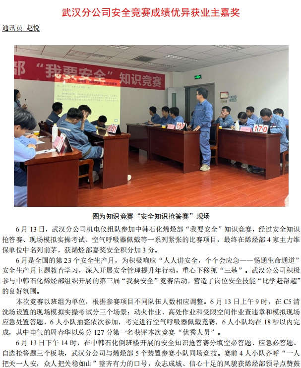 武漢分公司安全競賽成績優(yōu)異獲業(yè)主嘉獎(jiǎng)