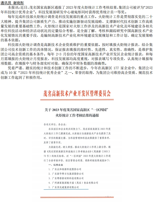 集團(tuán)公司榮獲茂名高新區(qū)“2023年科技統(tǒng)計(jì)優(yōu)秀企業(yè)”