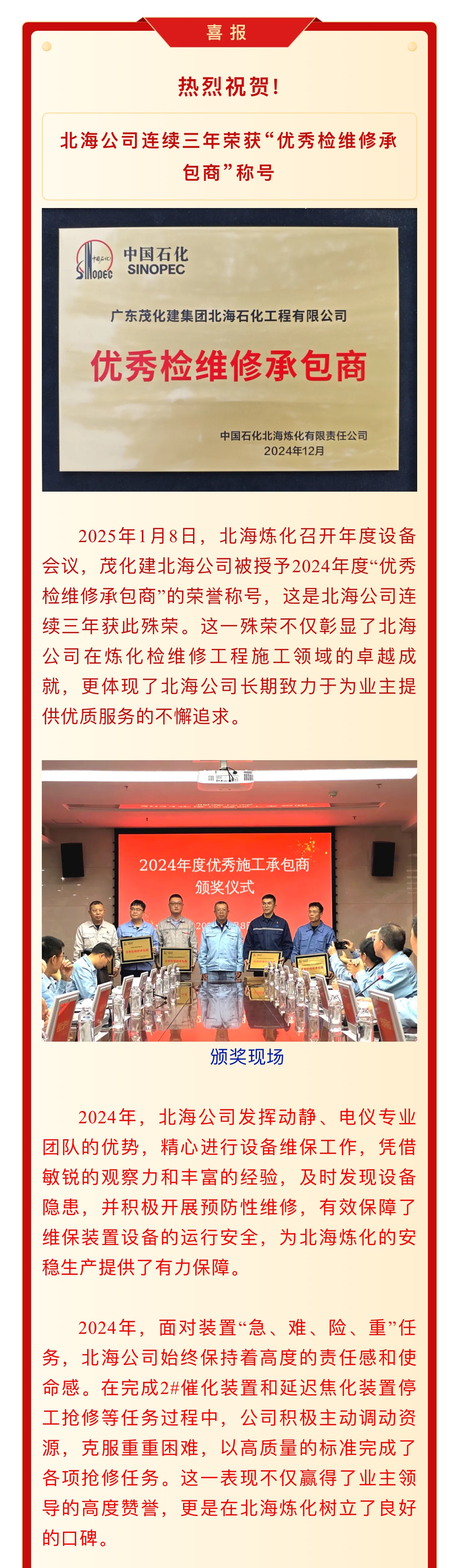 喜報(bào):北海公司連續(xù)三年榮獲“優(yōu)秀檢維修承包商”稱號(hào)