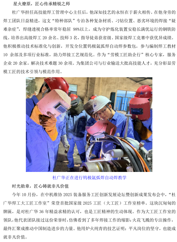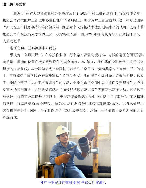 杜廣華被評(píng)為焊工首席技師 晉升國家“新八級(jí)工”制度中技能等級(jí)頂端